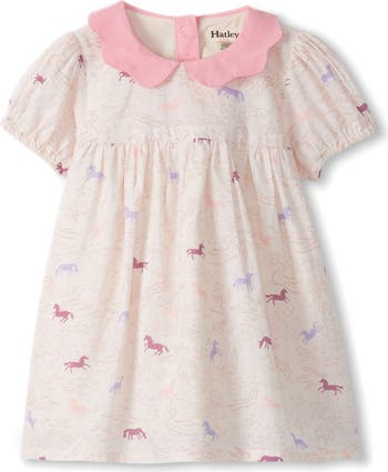 A scalloped-edge Peter Pan collar begins this supersweet cotton dress covered in a prancing pony print.