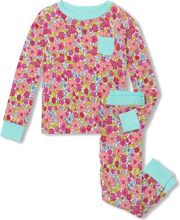 Soft and stretchy pajamas are splashed with bright blooms and finished with contrast—including a fun patch pocket.