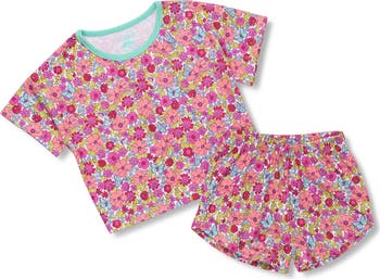 These lightweight short pajamas are splashed with bright blooms and finished with a touch of contrast at the neck.