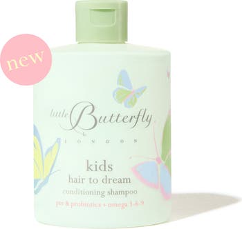 Get kids ready for carefree play and wild adventures with Little Butterfly London's Ecocert Cosmos certified-organic, clinically-proven, microbiome-friendly hair to dream KIDS conditioning shampoo (age 3+). Fortified with a balanced blend of Omega 3, 6 and 9 oils, and plant-based pre- and probiotic ECOSKIN, this natural fruity-fresh and vegan formula leaves hair shiny, strong, and touchably soft. Massage and rinse well to turn even the wildest hair dreamy.