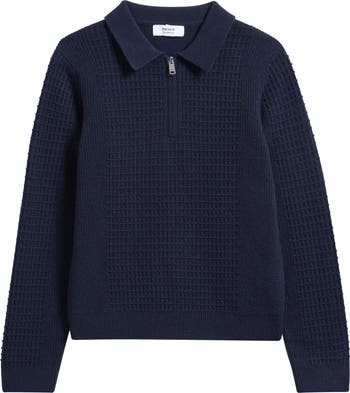 This long-sleeve polo features a grown-up-looking retro quarter-zip neckline and a mix of contrast textures so the wool drapes neatly.