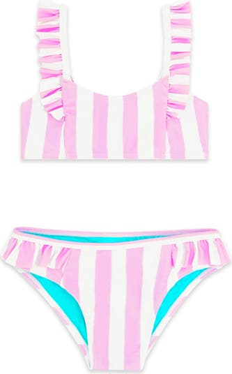 Retro stripes and flippy ruffles detail this supercute two-piece swimsuit that's lightweight, breathable and fast-drying, too.