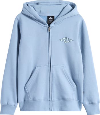 Your cool kid can stay cozy and casual in this zip-up fleece hoodie featuring retro surf graphics at the chest and back.