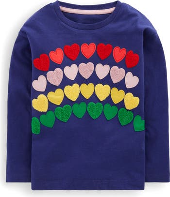 This long-sleeve cotton T-shirt is a wearable Valentine with its colorful arcing hearts in fun mixed textures.