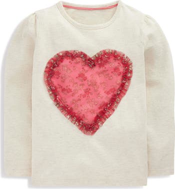 Slightly puffy sleeves frame with sweetness a long-sleeve cotton T-shirt that's a wearable Valentine with its heart-shaped tulle appliqué.