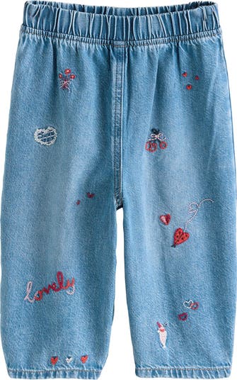 Cute meets comfy in these embroidered jeans dotted with hearts and blooms like a happy little storybook scene.