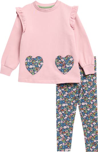 Colorful flowers pattern the heart-shaped pockets at the front of a ruffle-trimmed tunic paired with coordinating floral leggings your child will love.