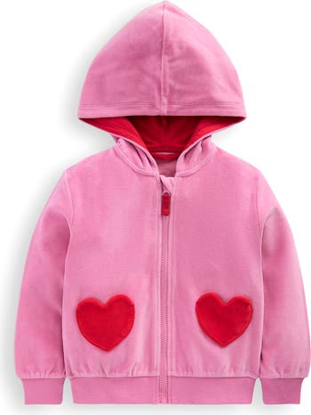 A pair of sweet heart-shaped pockets punctuates a zip-up hoodie made from plush cotton-blend velour.