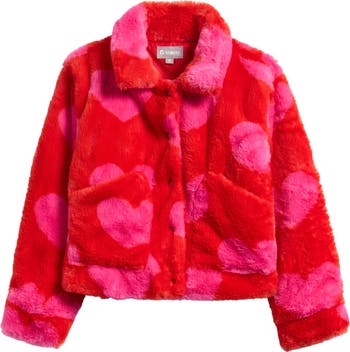 Plush faux fur printed with sweet hearts makes this warm, layer-ready jacket a winter favorite.