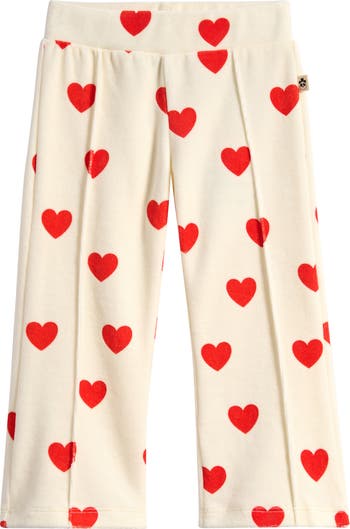 These heart-splashed velour pants deliver plush comfort and poppy character with pin-sharp front pintucks that frame the silhouette and add gentle structure to every step.