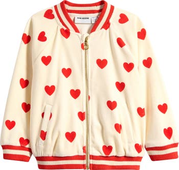 This baseball-style jacket with bright red hearts and classic striped trim is sure to be a favorite outer layer.