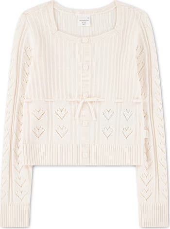 Darling pointelle hearts punctuate a mid-weight cardigan cinched at the waist with a drawstring tie.