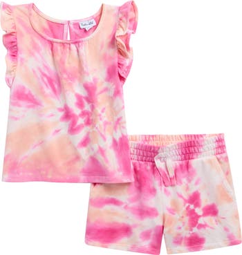 Kids will love the colorful tie dye and comfy cotton blend of this sunny-day-ready-set featuring a flutter-sleeve top and pull-on shorts.