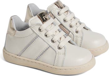 Metallic accents and rhinestone appliqués add kid-approved charm to a high-top leather sneaker featuring lace-up styling with a side zipper for easy entry.