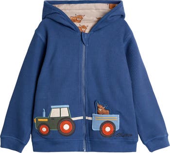 Your child will enjoy two farm-fresh looks in one with this reversible all-cotton hoodie featuring a solid waffle-knit with a pocket-pet tractor appliqué and a heathery print of highland cattle. Moo!