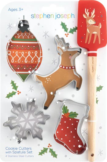 Give the perfect gift to yourself or the baker in your life with this holiday-themed set of assorted stainless steel cookie cutters and a wood-handled spatula boasting a colorful graphic.