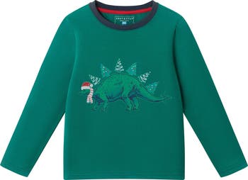 Festive graphics stamp the front of this kid-sized cotton T-shirt designed with long sleeve and plenty of comfortable stretch.