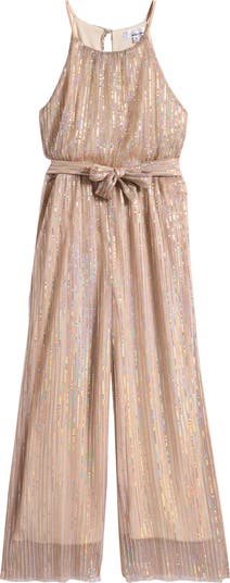 Light-catching holographic dots mesmerize with multi-hued shimmer on a kid-sized mesh jumpsuit fashioned with flowy wide legs.
