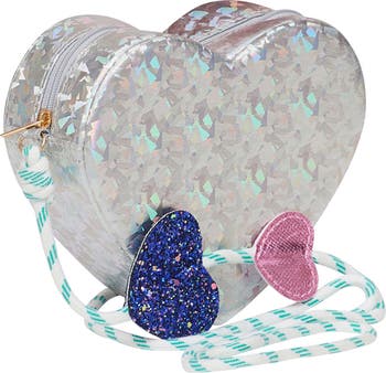 Show your kiddo some love with a heart-shaped bag that's patterned with holographic shapes and swung from a striped cord strap.