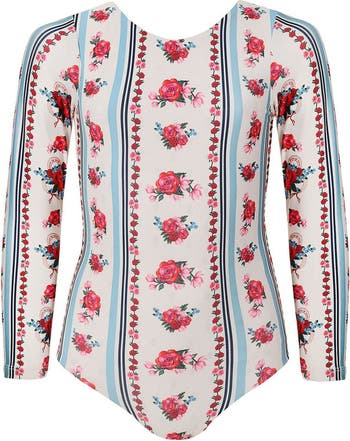 Long sleeves and a low back will have them feeling like they're on vacation in this one-piece rashguard swimsuit covered in a charming print.