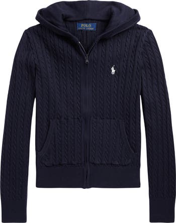 Soft cabling brings classic detailing to a hooded cardigan knit from breathable cotton and sized for kids who like to stay comfortable when they're looking nice.