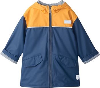 Encourage fun puddle-splashing in this kid-size raincoat featuring a roomy hood, easy zip-up front and reflective trim.