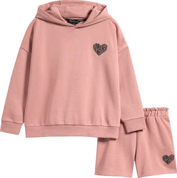 Elevate your young trendsetter's weekend wardrobe with this supersoft cotton set featuring the brand's 'Lover' heart graphic embroidered on both the hoodie and shorts.