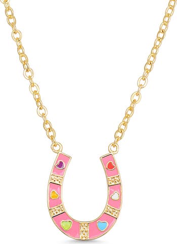 Bring bright color and definite shine to their look with this golden necklace anchored with a pink horseshoe pendant.