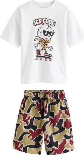 Keep your child extra cool while chilling at home or school in this two-piece cotton set featuring a playful graphic T-shirt paired with coordinating camo shorts.