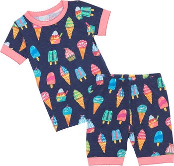 Rainbow-hued ice cream treats brighten soft and stretchy short pajamas that are ideal for staying comfy on warmer nights.