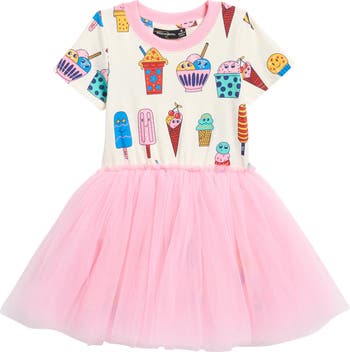 A cotton-jersey bodice is printed with sweet treats to complement the flouncy tulle skirt of a dress your imaginitive little one will love wearing.