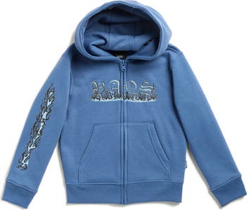 A cool flaming logo dances across the chest and sleeve of this staple cotton-blend hoodie made with a handy full-length zipper.
