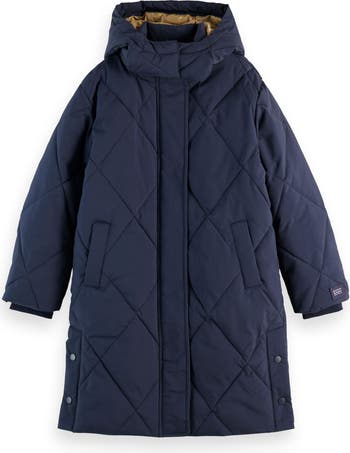 Let winter be winter while your child stays cozy in this water-repellent insulated puffer coat featuring diamond quilting and a commodious hood. Ribbed cuffs keep biting winds at bay, while snap side vents ease movement.
