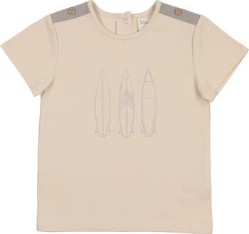 Little ones will have fun in the sun in this retro-cool top made with contrast trim, decorative buttons and a playful surfboard graphic.