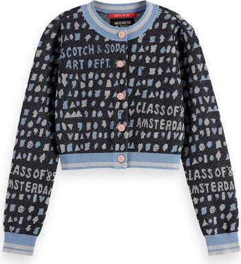 Perfect for kids who love a statement piece, this lightweight cardigan gives vintage vibes with its bold jacquard design and striped rib trim.