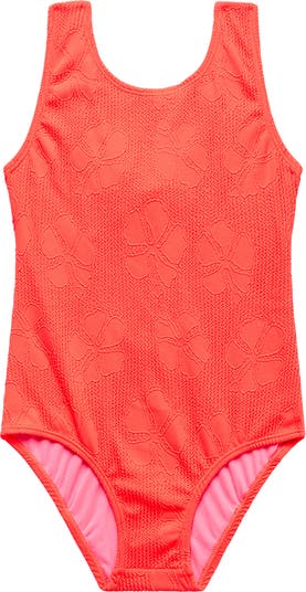Textured blooms and a twisted back cutout amp up the beach-day fun of this kid-approved one-piece swimsuit.