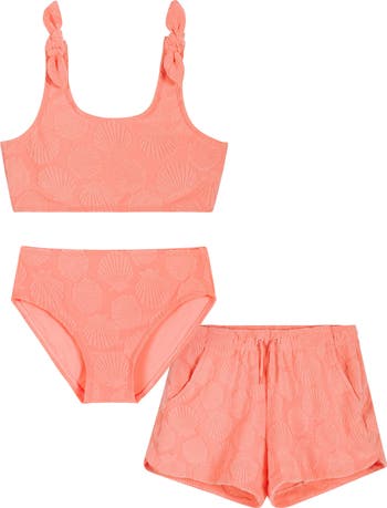They'll love to splash and play in this matching terry set featuring a two-piece swimsuit and matching cover-up shorts all patterned in tonal jacquard shells.