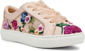 Ribbon laces and bright embroidered blooms signature Betsey Johnson charm to this kid-size sneaker that merges style and function.