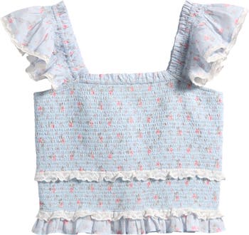 Dainty blooms cover a ruffle-accented crop top made from soft cotton and shaped by allover smocking.