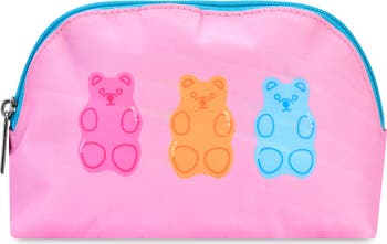 A trio of colorful jelly bears decorate a pretty pink pouch your kiddo will love.