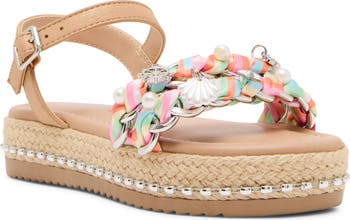 Colorfully print ribbon weaves through the shiny charm-ladden chains of a sweet, summery sandal set on an espadrille-style platform your mini will love.