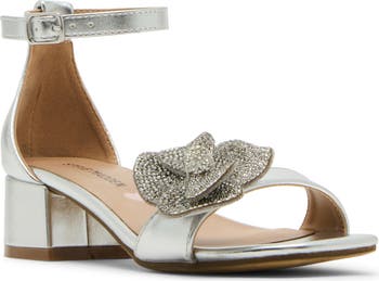 A jewel-encrusted floral appliqué adds whimsical charm to the metallic upper of a photo-worthy sandal set on a low block heel to give your kiddo a subtle hint of height.