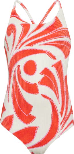 They'll love the soft texturing of this sporty one-piece swimsuit with crisscross straps.