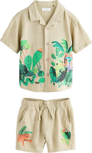 In the jungle, the mighty jungle, your kiddo will explore in cute comfort thanks to this playfully printed camp shirt and matching shorts set cut from breezy linen-kissed gauze.