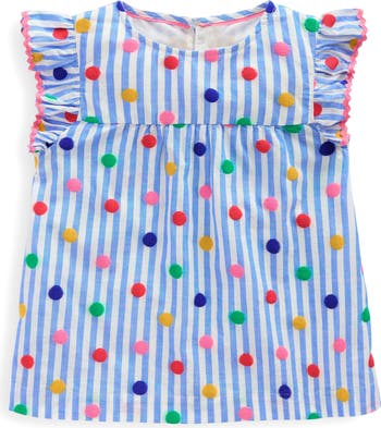 Cheery textured dots augment the perky stripes of a cotton top that's framed by rickrack-trimmed flutter sleeves for extra cuteness.