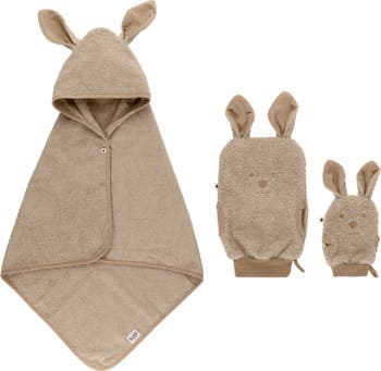 Get your little one cozy and dry after tub time with this adorable, highly absorbent cotton-terry towel designed with a playful kangaroo-themed hood. The set also comes with two matching washcloths—one sized for you and one sized for your kiddo.