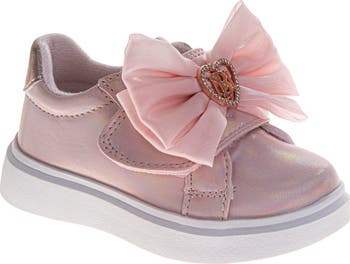 Signature logo accents and a voluminous bow add kid-approved charm to a play-ready sneaker grounded by a grippy rubber cupsole.