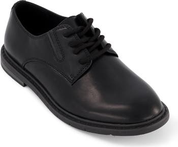 An easy-on design with elastic gore insets offers a customized fit on a kid-approved derby grounded by a cushioned footbed and grippy rubber sole.