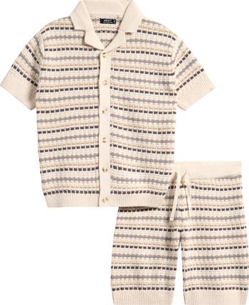 Textural cotton-blend knit defines a shirt and shorts set that has your little one looking cool while feeling comfortable from playground dates to weekend outings.