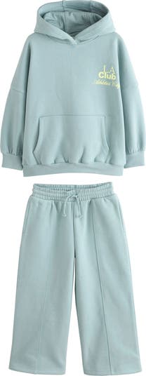 Your active child will look the part of an off-duty runner in this roomy cotton-rich hoodie and sweatpants set that's stamped with sporty club graphics.